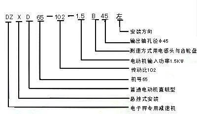 | 型號 | 電機功率 | 減速比 | 安裝方式 | 測速方式 | 處軸孔徑 | 安裝方向 |